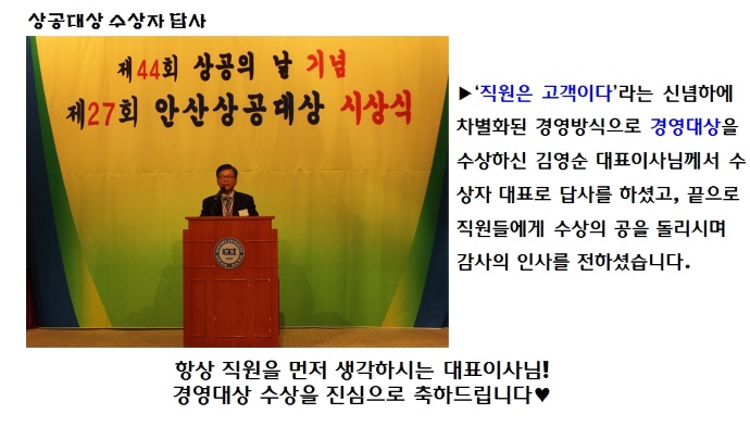 제 27회 안산상공대상 시상식에서 경영대상을 수상하였습니다.